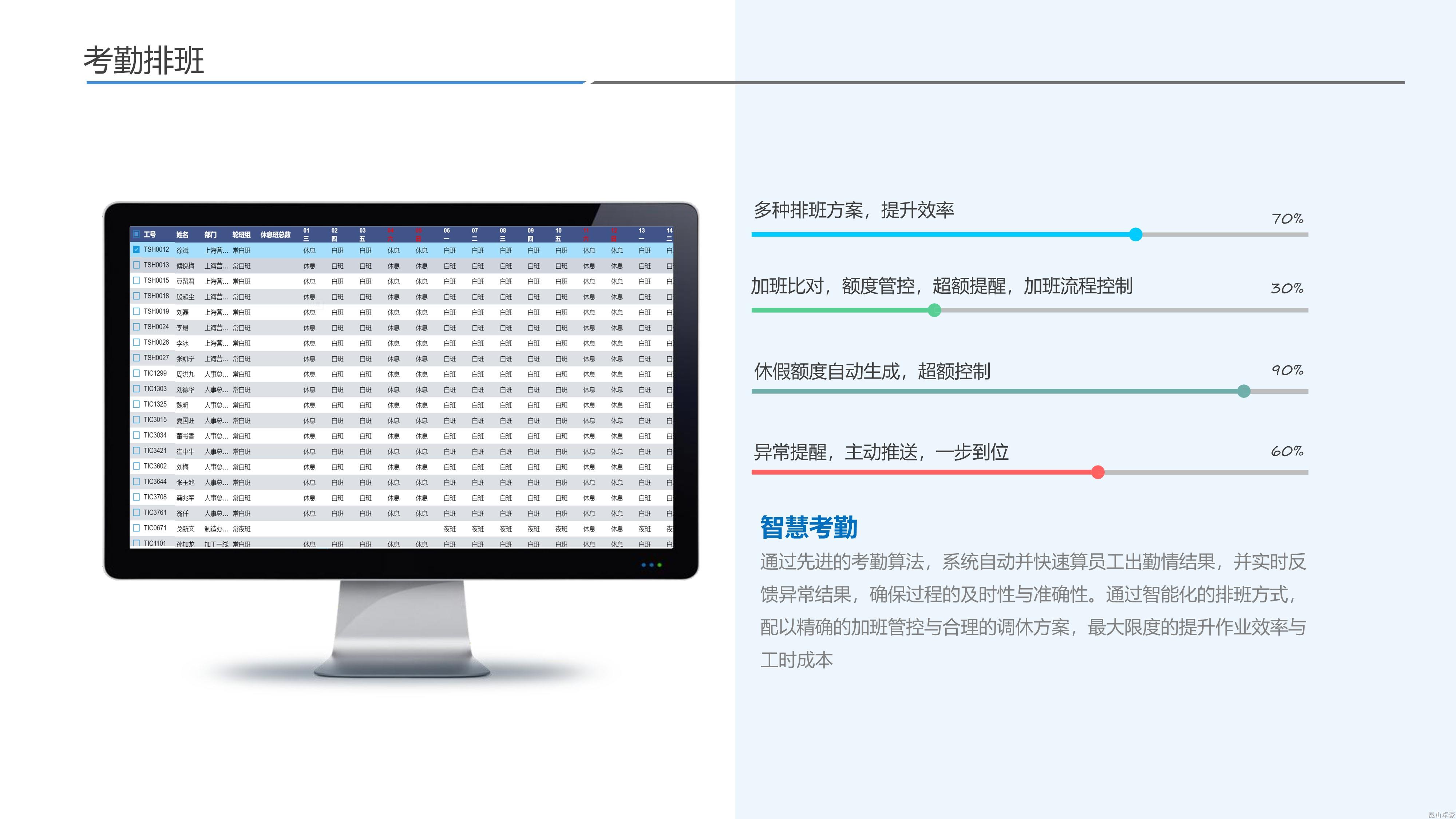 灵活的可视化平台,支持各类自定义管理(数据、流程、报表、组织架构、薪资、考勤、排班绩效等)。