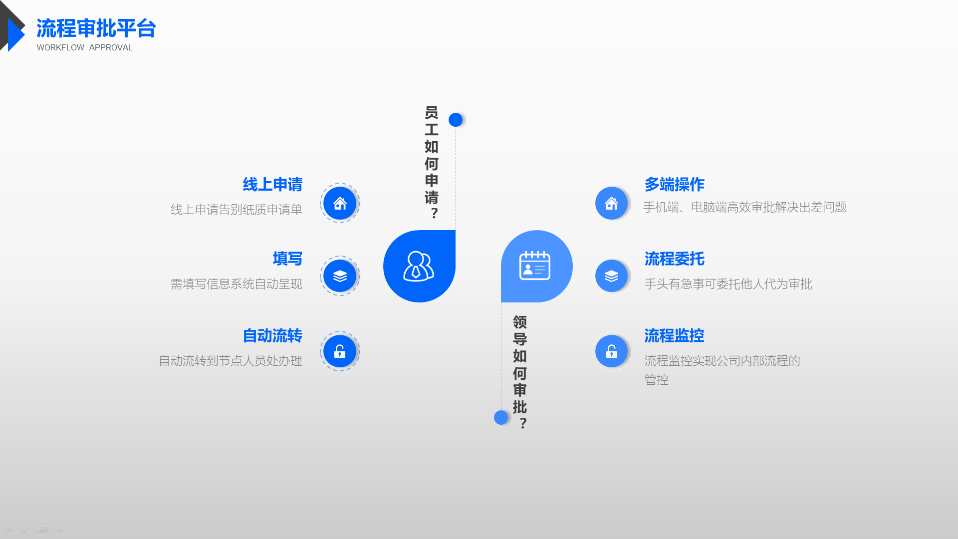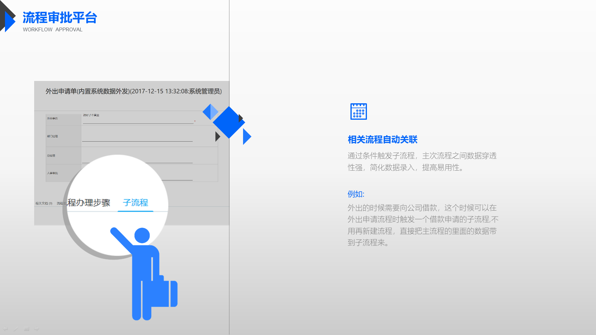 赋予企业流程更强能力,消息、时间、移动、发布、订阅、催办、权限、附件、授权、传阅、关联、标签,12大机制,支撑流程灵活调用,让流程应用能力更强。